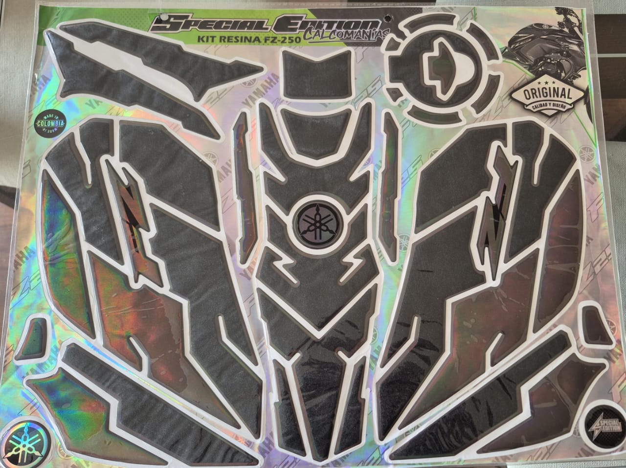 El kit incluye piezas para el frontal, laterales y tapa del estanque, cada una diseñada para calzar perfectamente con las formas de la FZ250, logrando una instalación precisa y un acabado profesional.